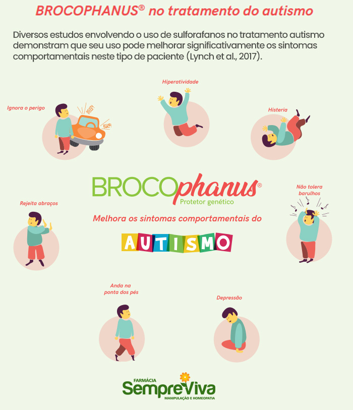 O Brocophanus® é um ativo fitonutricional manipulado que combina extratos de brócolis (Brassica oleracea) e rabanete-negro (Raphanus sativus niger), padronizados para entregar sulforafano (composto bioativo típico de brotos de brócolis) junto com mirosinase (enzima que ajuda o organismo a formar sulforafano a partir da glucorafanina). Ele é estudado como coadjuvante para aliviar sintomas comportamentais do autismo, graças à sua ação antioxidante, anti-inflamatória e de ativação da via Nrf2, um “interruptor” celular ligado a mecanismos de defesa e detoxificação.